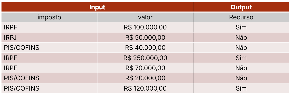 Regra: se valor \(\geq\) 100 \(\rightarrow\) recurso